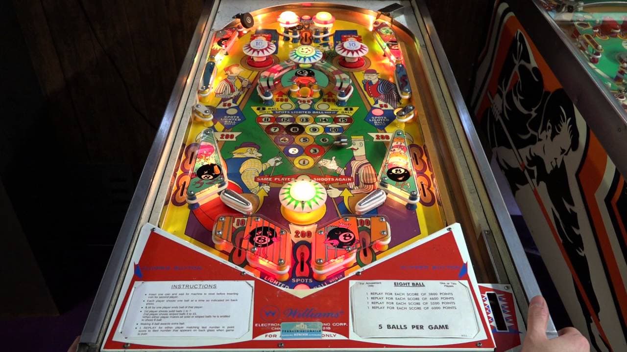 The "8 Ball" pinball machine, released by Williams Manufacturing Company in March 1952, is a single-player, electro-mechanical game designed by Harry Mabs, with artwork by George Molentin.