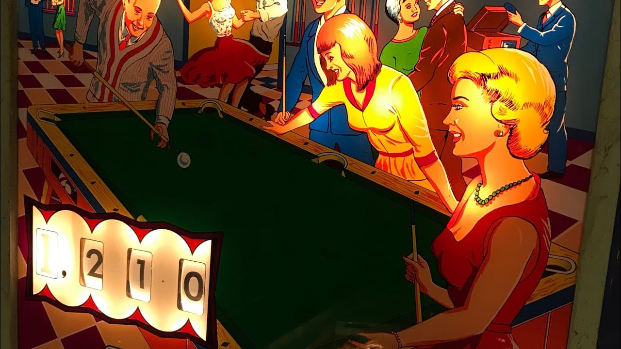 Flipper Pool is a bit more tournament-suitable than its replay sister, Bank-A-Ball, assuming extra balls are left on. Collect 12 pool balls to add a ball; balls 13, 14 and 15 also add a ball. When you get all 15, the balls reset. On standard settings, add-a-balls are also awarded at 2000 and 4000 points. When lit for “mystery,” the side lanes score 100 or 200 points. The bumpers are lit by either side lane at the top and by either return lane to the flippers. By the way, this was the first pinball machine to have the now-standard return lanes. The center stand-up 8-ball target turns the bumpers off. There’s little strategy to speak of, just flip the ball into the bumpers and nudge for the best. The only reason to shoot at a stand-up target is if you need it for an add-a-ball. Gottlieb’s marketing folks made a big deal when this machine came out about the “animated backglass” where the balls scored drop down in the glass box there.