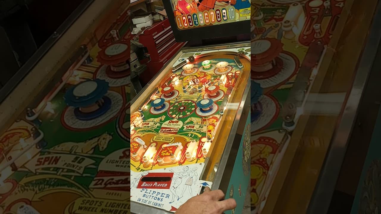 "Corral," a pinball machine released by D. Gottlieb & Co. in September 1961, is a single-player electro-mechanical game designed by Wayne Neyens, with artwork by Roy Parker. This western-themed game features two flippers, six pop bumpers, a passive bumper, and a roto-target. Notably, "Corral" does not have gobble holes, a common feature in many machines of the time, and it introduced the "score-to-beat" mechanism, allowing operators to set a high score for players to challenge.