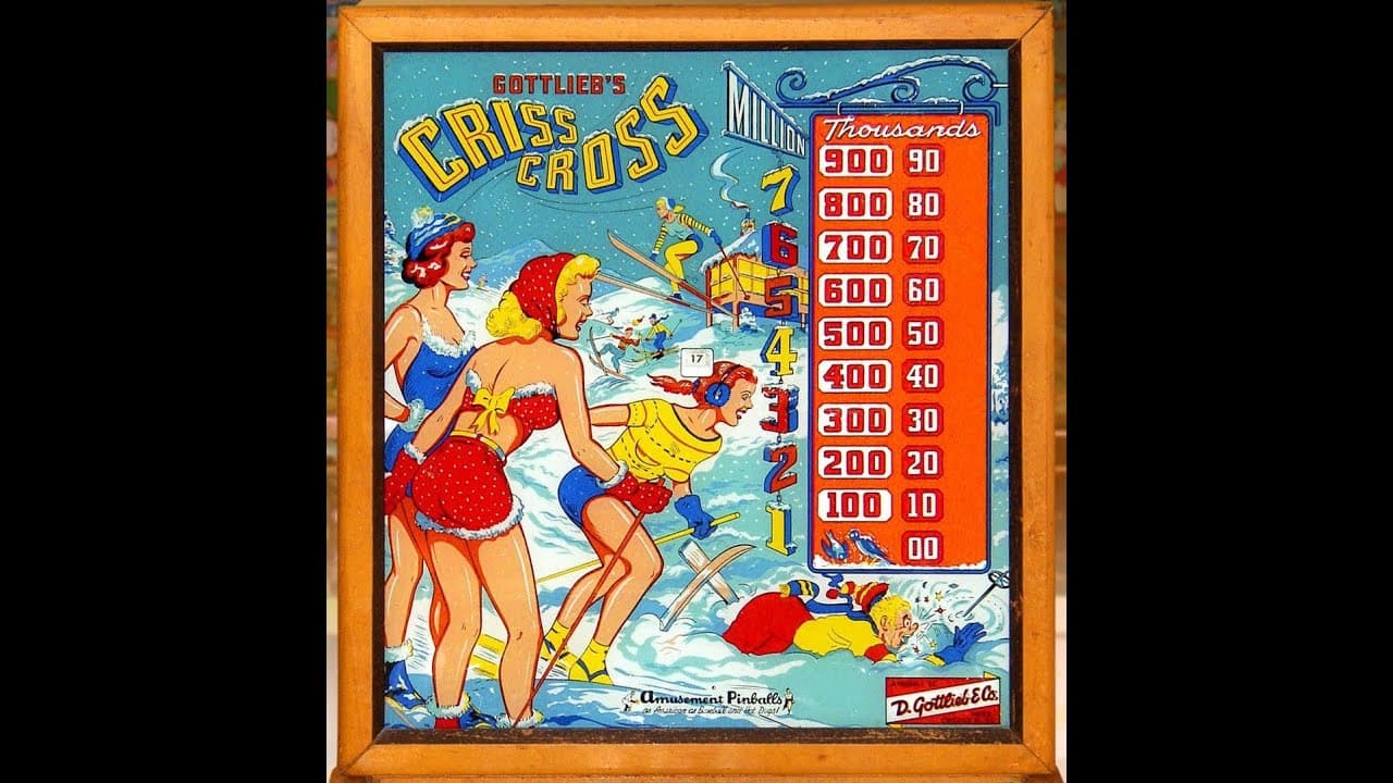 "Criss Cross," released by D. Gottlieb & Co. in February 1958, is a one-player electro-mechanical pinball machine with a skiing theme. Designed by Wayne Neyens with artwork by Roy Parker, it features two flippers, five pop bumpers, two slingshots, two gobble holes, and a bullseye target, as well as a roto-target that uses colored sections rather than numbers.