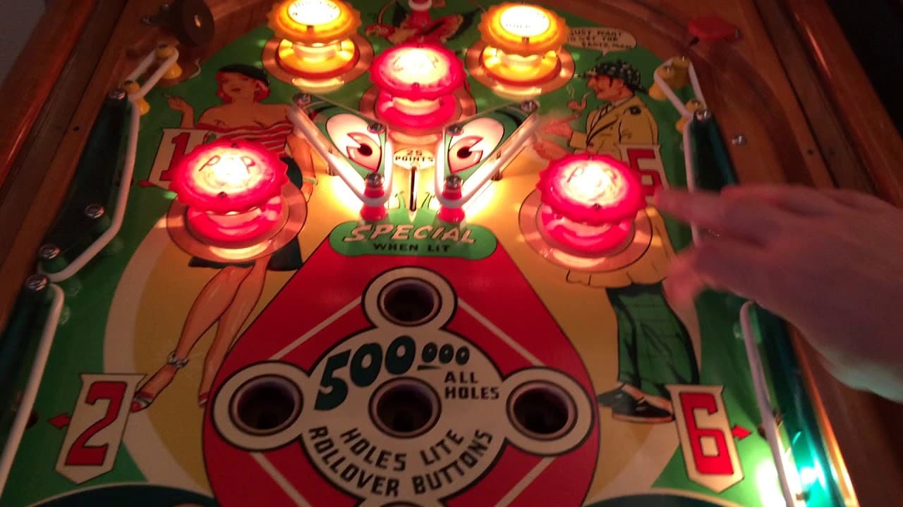 The "Dragonette" and "4-Belles" pinball machines, both produced by D. Gottlieb & Co. in 1954, share identical playfield designs but feature distinct thematic artwork. "Dragonette," released in June 1954, satirizes the popular "Dragnet" television show. In contrast, "4-Belles," introduced in October 1954, showcases a nautical theme. Both machines were designed by Wayne Neyens, with artwork by Roy Parker, and include two flippers, five pop bumpers, and five trap holes.