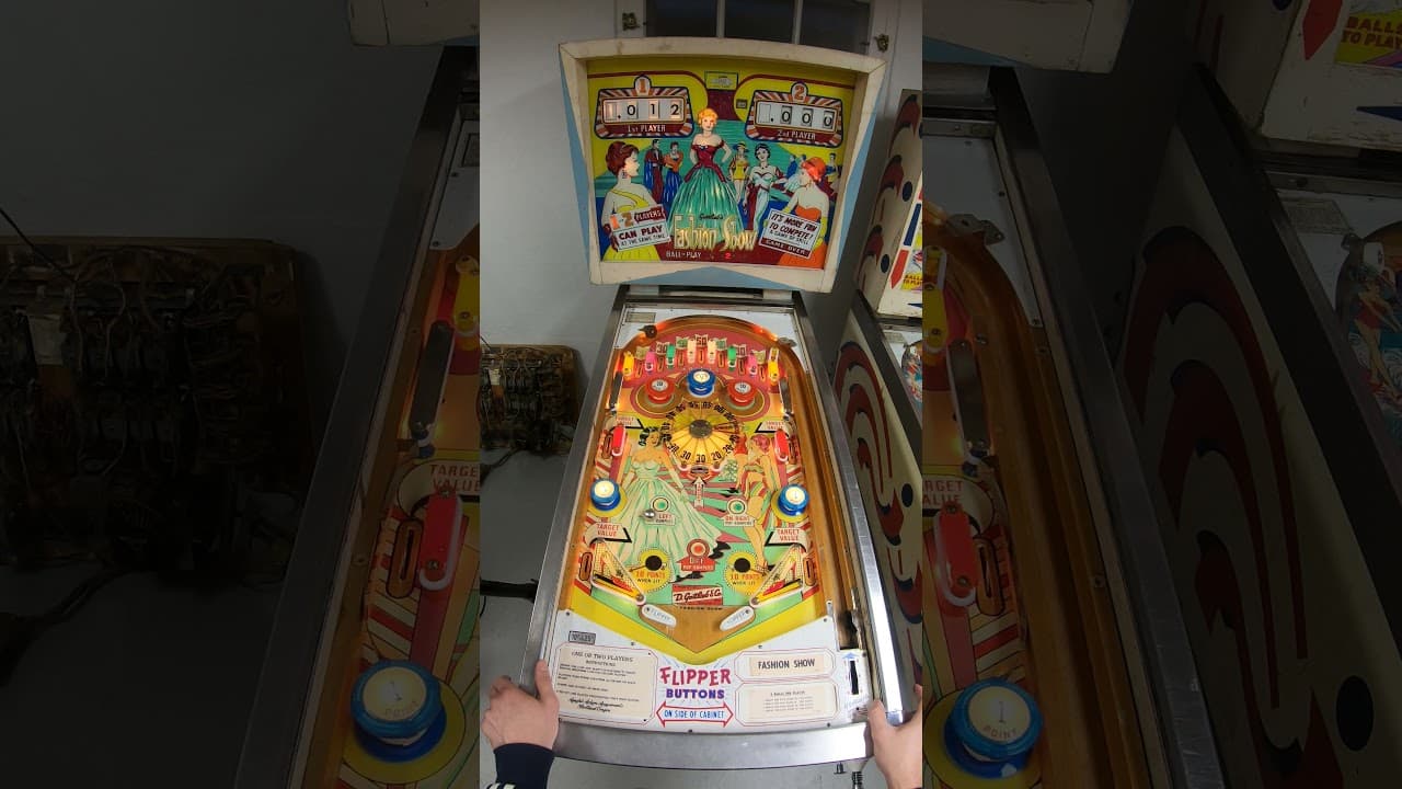 "Fashion Show," released by D. Gottlieb & Co. in 1962, is a two-player electro-mechanical pinball machine designed by Wayne Neyens with artwork by Roy Parker. This machine features two flippers, three pop bumpers, two slingshots, and a rotating center disc that advances scores when hit. The game’s theme revolves around pageantry and fashion, highlighted by its charming backglass artwork.