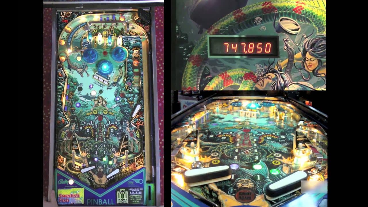 "Fathom," released by Bally in 1981, is a classic pinball machine designed by Ward Pemberton with artwork by Greg Freres and Kevin O'Connor. This game features an underwater theme with mermaids and sea monsters. It has three flippers, three pop bumpers, multiple drop targets, and a three-ball multiball mode, offering a richly detailed and engaging gameplay experience.