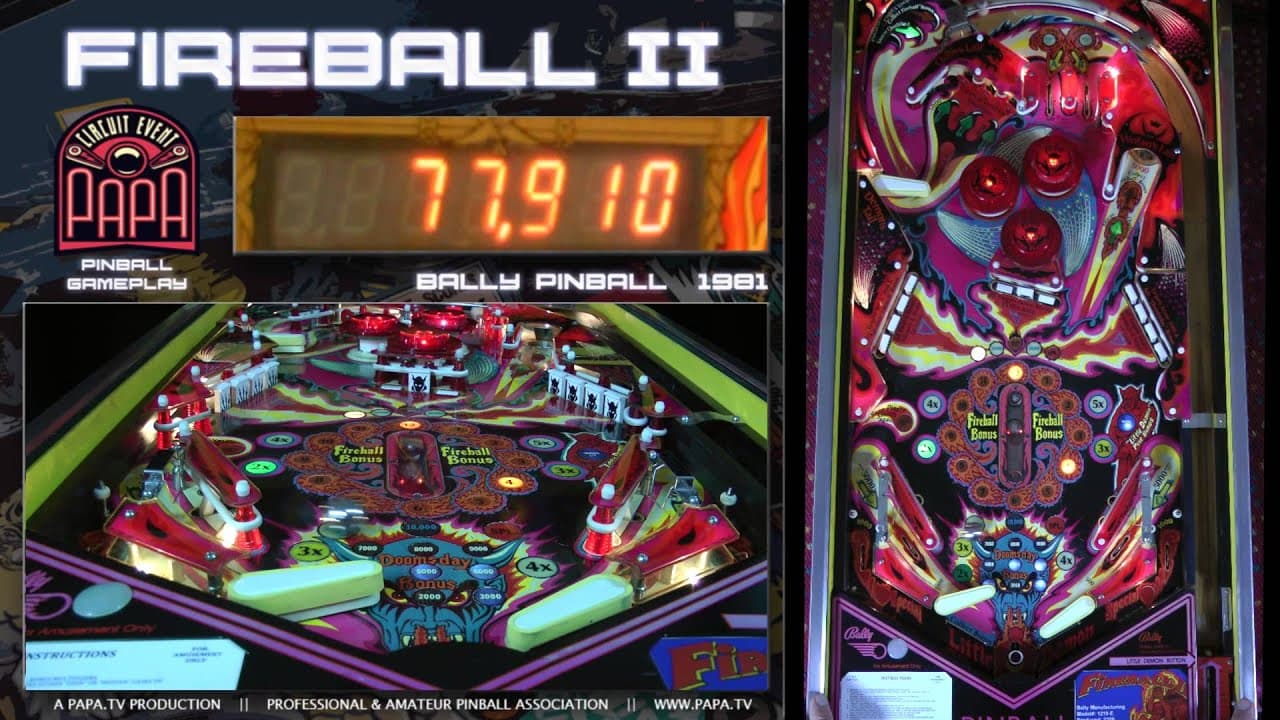 "Fireball II" is a 1981 pinball machine by Bally, designed by Gary Gayton with artwork by Dave Christensen. This solid-state game features three flippers and a three-ball multiball mode. The playfield includes various targets, spinners, and a captive ball, providing dynamic gameplay.