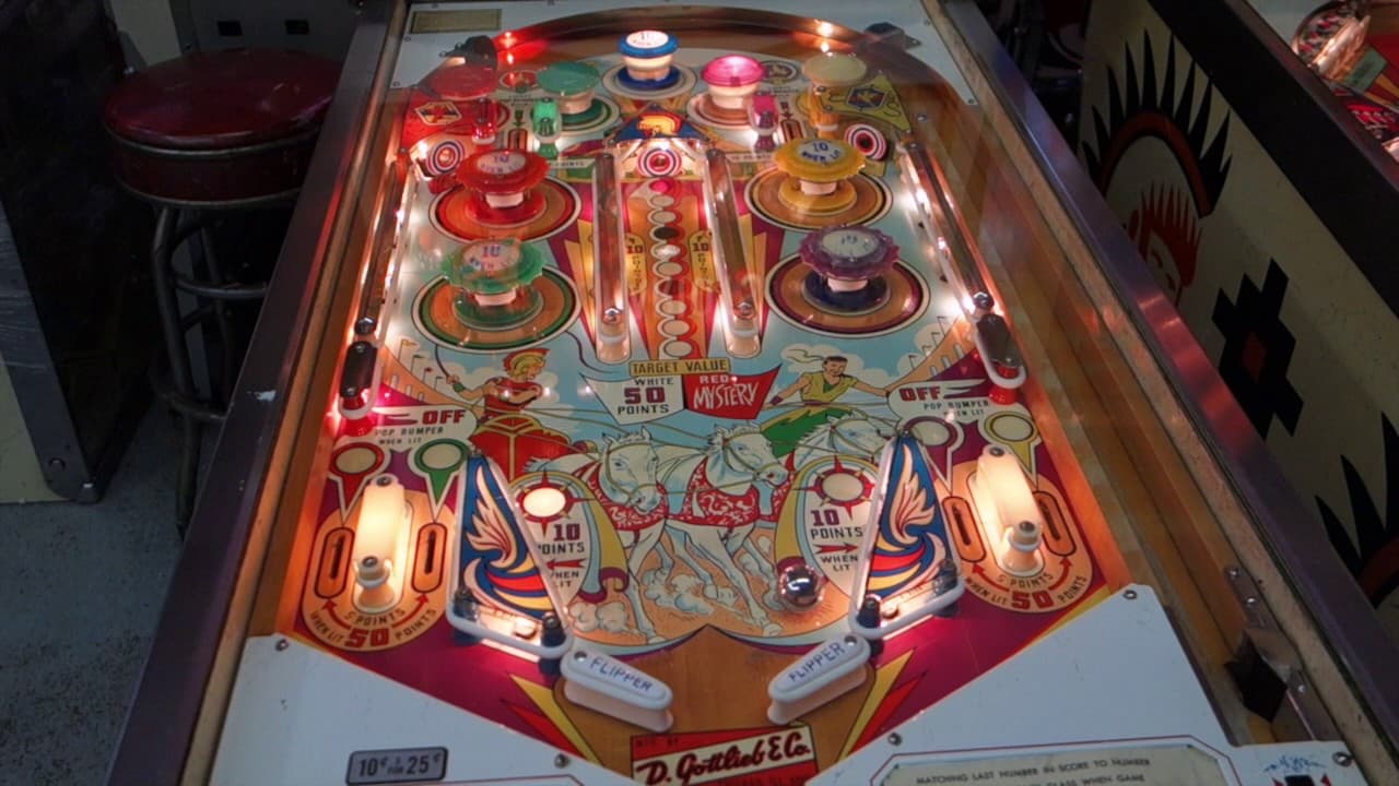 "Flying Chariots" is a two-player electro-mechanical pinball machine released by D. Gottlieb & Co. in November 1963. Designed by Wayne Neyens with artwork by Roy Parker, the game features two flippers, four pop bumpers, five passive bumpers, two slingshots, and three targets.