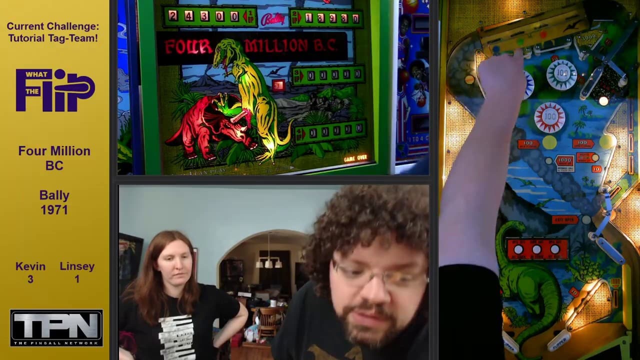 "Four Million B.C." is a 1971 pinball machine by Bally, designed by Ted Zale. This game features a prehistoric theme with two flippers, a single ramp, and a three-ball multiball option. Players aim to score points by hitting various targets and advancing through different playfield features reminiscent of a dinosaur era.