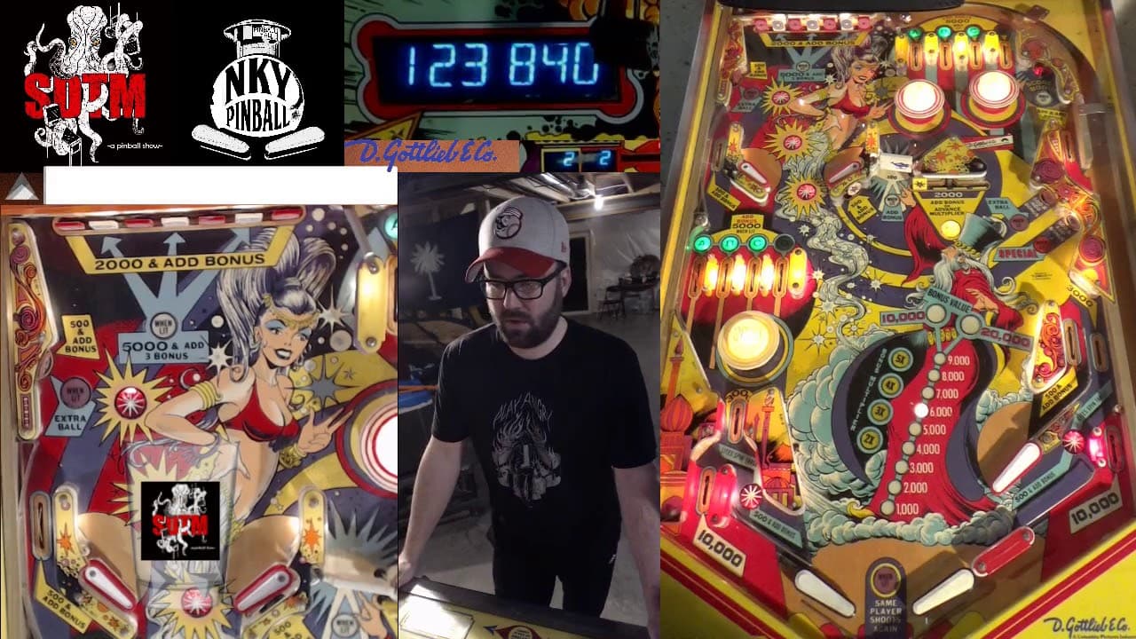 Genie was a better game when first released than it is now. I’ve only played one Genie in the past decade that played fast and clean; the others were slow and tedious, set shallow to attempt to offset weak flippers. Most Genies’ flippers are no longer able to zip the ball around the game adequately. In one case, a wise tournament director replaced the metal pinball with a lighter ceramic one, which made the game play roughly as it originally did. My description of how to play Genie here will presume you have tolerable but not great flipper power. Bonus is important on Genie. Hitting any drop target in the 4-bank above the right flipper will increase your bonus multiplier when the bank is lit. It cycles on switches, so if it’s not lit, go up top through either the center spinner from the left flipper or your choice of spinner or towards the upper playfield from the right flipper. If the spinner is lit, take it from either flipper, but remember getting your bonus X is more important if both the spinner and the drop target bank are lit. Most Genie spinners don’t give a lot of spins per shot. Genie is yet another Gottlieb game with a collect bonus saucer that activates automatically once your base bonus reaches 20,000. As with the other such games, you’re better off not collecting it unless your bonus multiplier is 4X or 5X; if you’re below that, work on raising the multiplier first. When you have the ball in the upper left mini-playfield, try to finish one color set, either red [4 drops] or white [3 drops]. Getting a set scores 10,000 and lights the white targets to be worth more – as the playfield says, 5000 and 3 bonus advances. In my experience, though, most Genies’ upper flippers are too weak to allow you much ball control or the ability to aim precisely, so do what you can to just keep the ball up there. Ignore all standup targets. Also try to avoid the A-B-C-D lanes at the lower left. If the ball does go over there, try to get the ball to exit to the center of the playfield rather than down the 50-50 drain lane below the bumper. If it does go down there, you’ll need some precise nudging to save the ball. Remember when doing so that you’re nudging the machine under the ball, not the ball! Nudge from the right, but timing is critical. Plunge is largely irrelevant, since all lanes score the same, but I like the A since the ball sometimes bounces off the bumper towards the upper left mini-playfield.