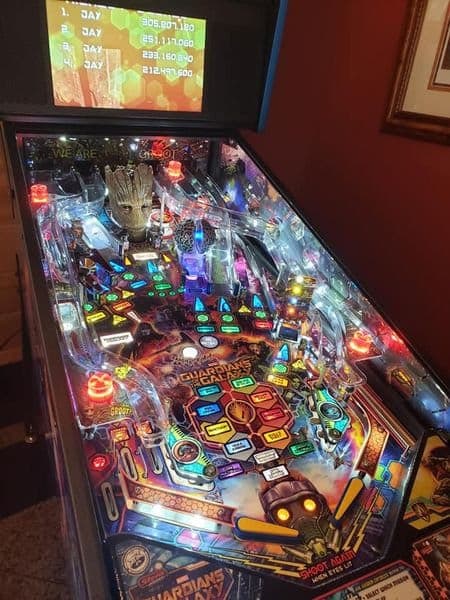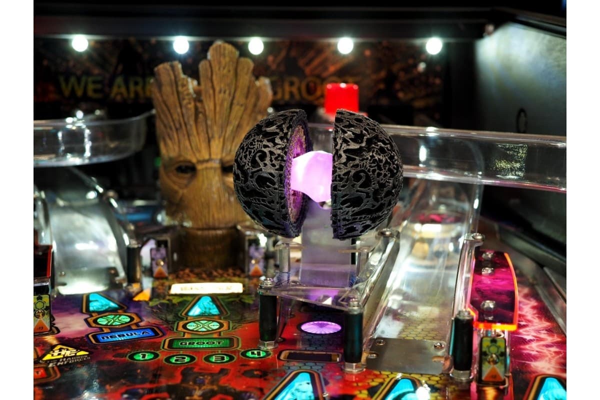 The "Guardians of the Galaxy" pinball machine, produced by Stern Pinball in October 2017, is based on the popular Marvel movie franchise. Designed by John Borg, this machine features two flippers, two ramps, and the Stern SPIKE 2 System. It offers dynamic gameplay with six multiball modes and interactive elements such as a motorized orb toy and Groot’s mouth, which locks balls for multiball play.