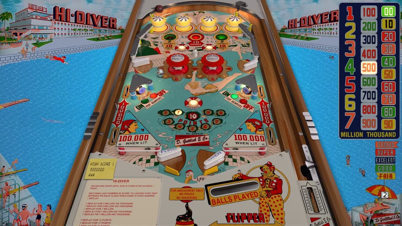 The Hi-Diver pinball machine, released by D. Gottlieb & Co. in April 1959, was designed by Wayne Neyens with artwork by Roy Parker.