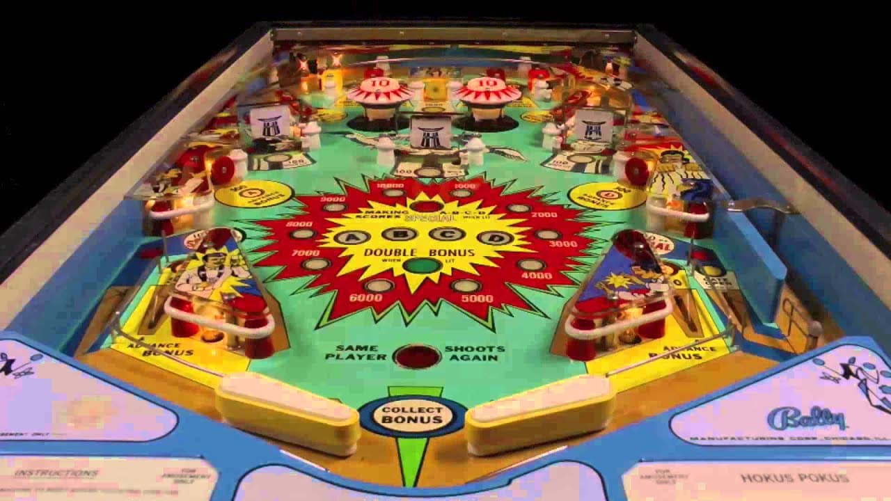 "Hokus Pokus," released by Bally Manufacturing Co. in March 1976, is a two-player electro-mechanical (EM) pinball machine with a magic-themed design. Created by Greg Kmiec with artwork by Christian Marche, this machine features two flippers, two pop bumpers, three spinning targets, and five star rollovers, among other elements. Notably, it has a right outlane ball return gate and an end-of-ball bonus.