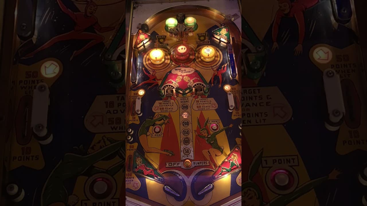 "Jumpin' Jack's" is a two-player electro-mechanical pinball machine released by Williams Electronic Manufacturing Company in April 1963. Designed by Steve Kordek, with artwork by George Molentin, the game features a circus or carnival theme, capturing the lively atmosphere of such events. The playfield includes two flippers, three pop bumpers, two passive bumpers, two slingshots, five rollover buttons, two gobble holes, and two drop targets.