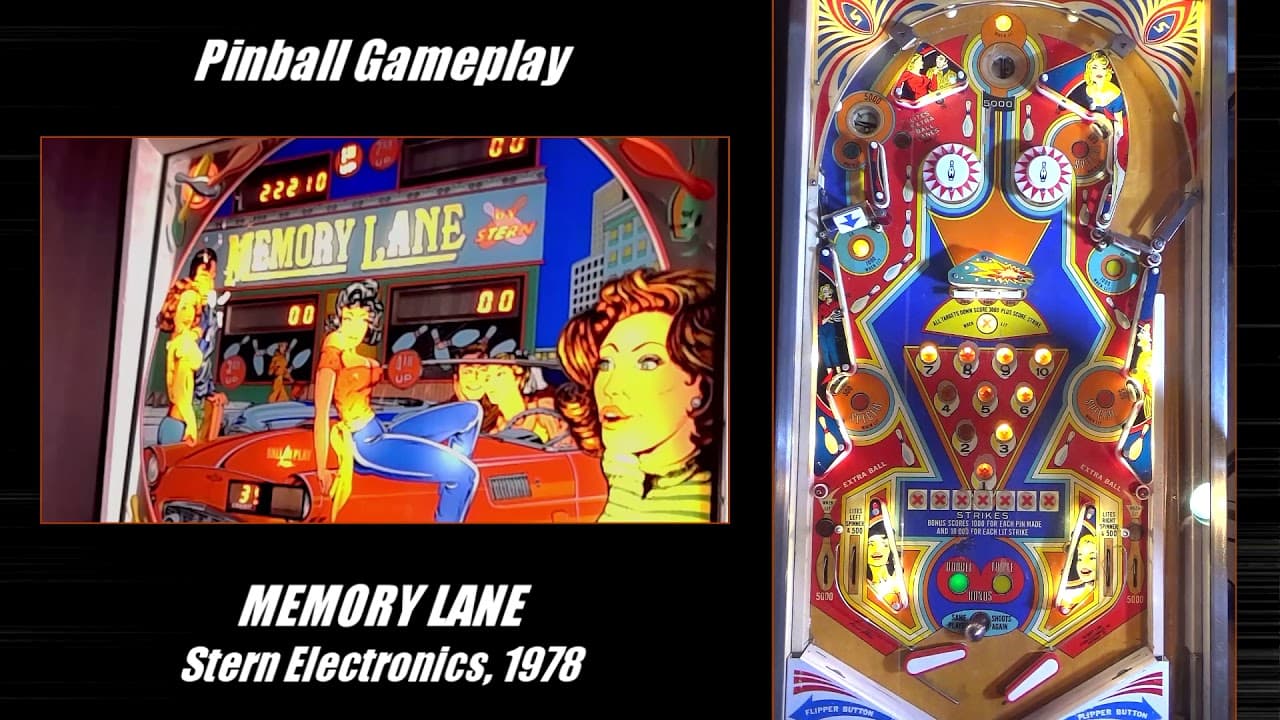 The Memory Lane pinball machine, released by Stern Electronics in June 1978, is a solid-state game with a bowling theme. Designed by Sam Stern and Mike Kubin, it features two flippers, two pop bumpers, three standup targets, and ten rollover buttons arranged like bowling pins. This machine was one of the last from Stern to use an electro-mechanical chime unit before moving to electronic sound boards in later models like Lectronamo.