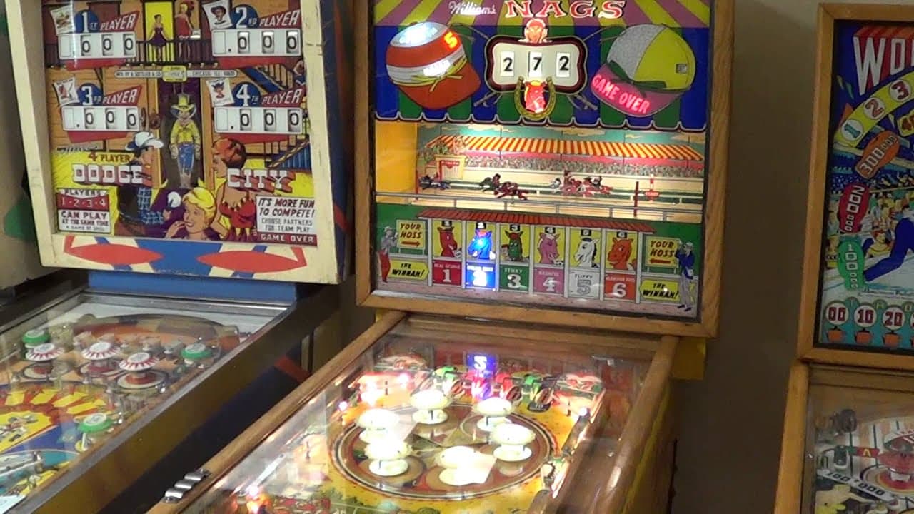 The "Nags" pinball machine, manufactured by Williams in 1960, is a unique and highly collectible electro-mechanical game known for its horse racing theme. One of its standout features is the mechanical horse race animation in the backbox, where six horses compete towards the finish line, triggered primarily by the corresponding pop bumpers on the playfield.