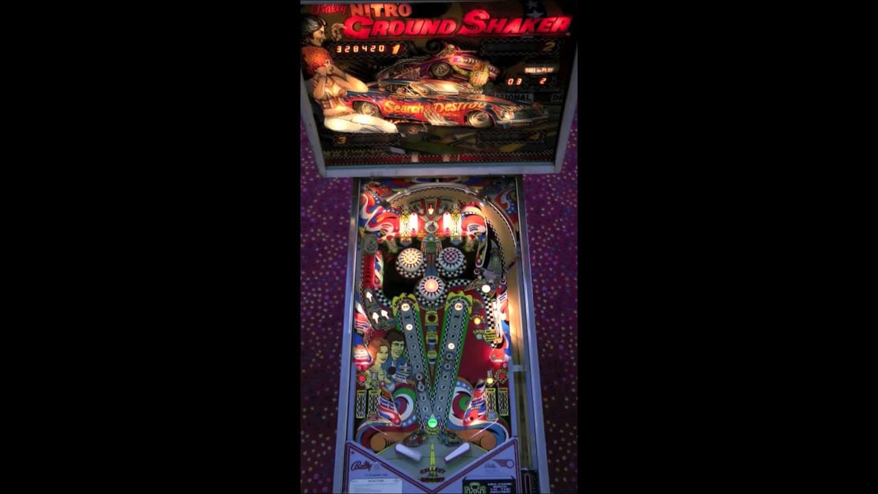 The Nitro Ground Shaker pinball machine, released by Bally in 1980, is a drag-racing themed game designed by George Christian with artwork by Dave Christensen. Known for its vibrant and detailed art, this game captures the excitement of auto racing.