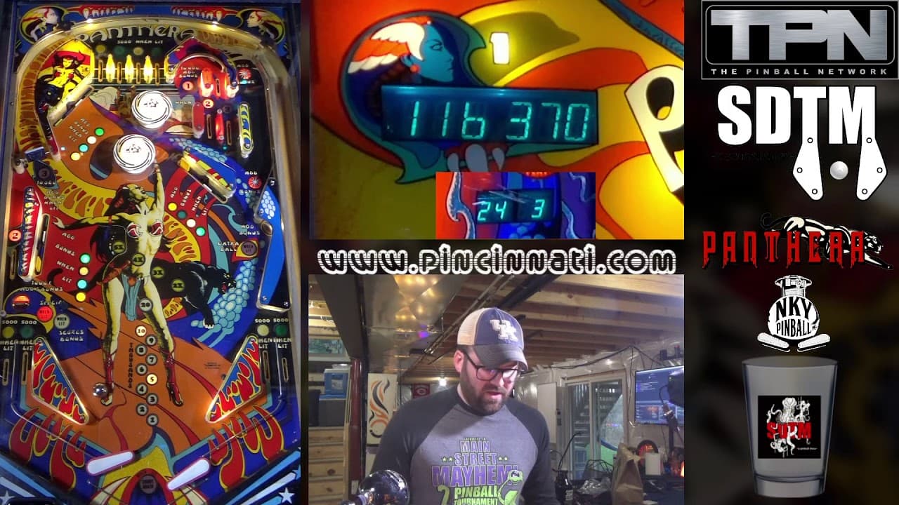 Panthera is a bit better score balanced than some of its peers. It’s also got a dozen drop targets for fans of these which are worth enough to play for. Bonus is advanced by lit drop targets, the top right star rollovers, the right side bullseye target and lit 1-2-3 lanes. Base bonus goes up to 29K. Advancing your bonus multiplier is a two-step process. First, you need to score top lanes to light the drop targets of matching colors – white, green, yellow and blue. You then need to knock down all three lit targets of the same color to advance you one multiplier, up to 5X. At the end of a ball, any drop targets you knocked down that were lit stay down, ones you hit that were unlit pop back up. Base bonus resets but colored lanes and multiplier are held. You want to hit drop targets when lit not just to work on your bonus X but because they’re worth 5K lit, just 500 unlit. The top lanes also light the corresponding color return lanes and outlanes for 5K rather than 500. The top lanes are only worth 5K the first time you score them; likewise, the 1-2-3 lanes are worth 10K only the first time. The saucer below the left #2 lane scores 10K and 3 advances, but the ball doesn’t always settle into it when exiting that #2 lane. Once you have at least 20K in base bonus, this saucer lights to collect bonus. When collected, base bonus resets but multiplier is preserved. Basic strategy is to go up top via the left spinner and right rollover star lane to get all the colors lit. Once you’ve done that to make your targets worth 5K and set up getting your multipliers, shoot the drop targets. Focus on completing a color set at a time rather than one or two of each. Since your bonus multiplier is held, it’s important to get it up as high as possible on ball one. As soon as you have your bonus at 20K with a multiplier of 3X or better, try to get the ball in the left collect bonus saucer. There are at least three ways to do this: shoot at it directly, which may risk a left side drain; nudge the ball into the top of the left #2 chute, although the ball will sometimes skip through; and have the right slingshot kick the ball into it, perhaps with a nudge assist on your part. Yes, that sound you recognize is the same as on Counterforce - - thrum, thrum, thrum, thrum, and the wiggly-screech at the end.