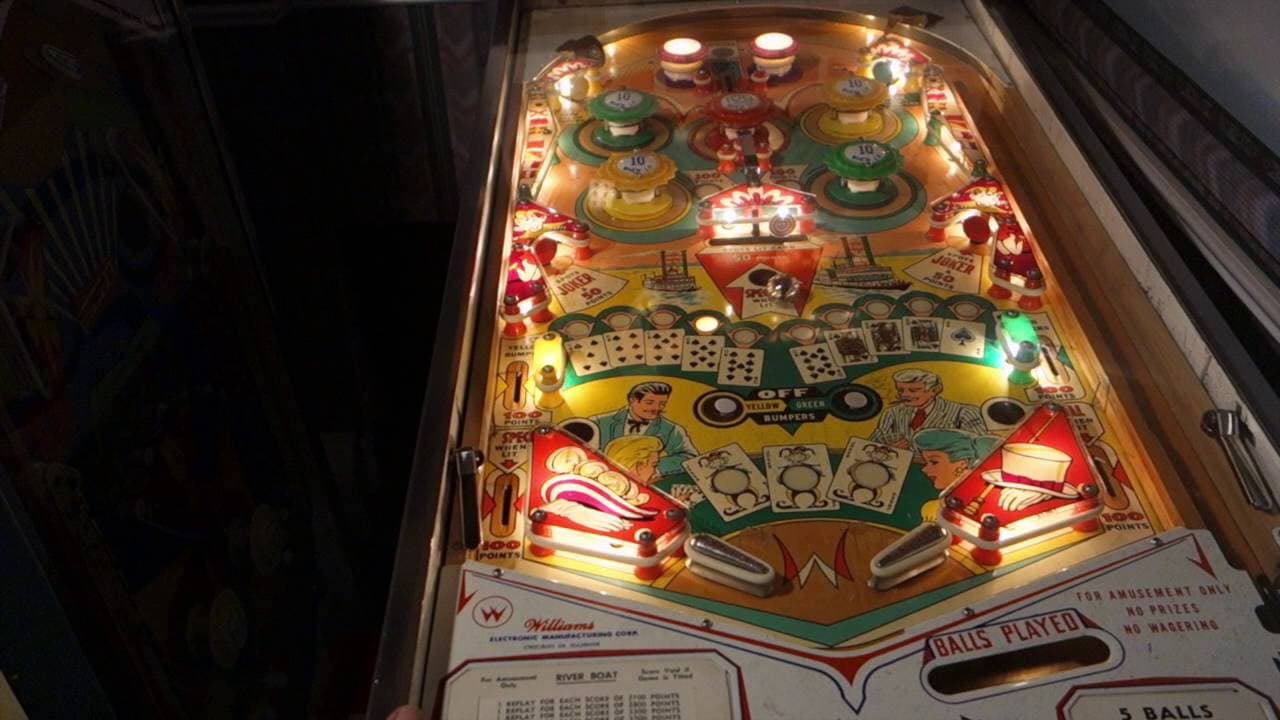 River Boat, released by Williams in 1964, is a single-player electro-mechanical pinball machine designed by Norm Clark. With a theme centered around American riverboats and gambling, the game features two flippers, five pop bumpers, four standup targets, and a swinging target.