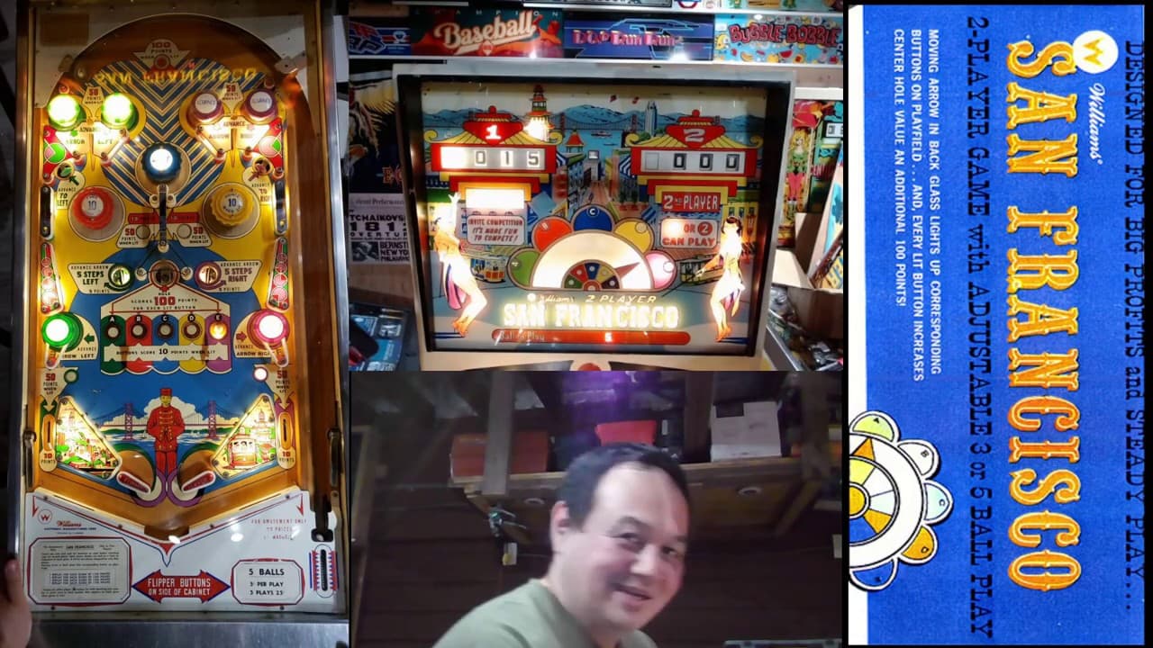 "San Francisco" is a two-player electro-mechanical pinball machine released by Williams Electronic Manufacturing Company in May 1964. Designed by Steve Kordek, with artwork by George Molentin, the game features a vibrant San Francisco theme, capturing the essence of the city's landmarks and culture. The playfield includes two flippers, three jet bumpers, six passive bumpers, two slingshots, six rollover buttons, two standup targets, two kick-out holes, a gobble hole, and a rollunder.