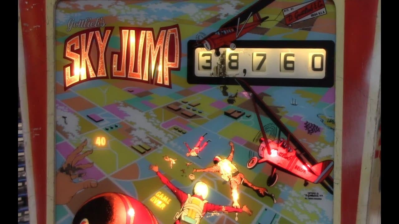 "Sky Jump," a 1974 pinball machine by Gottlieb, is designed by Ed Krynski with artwork by Gordon Morison. This electro-mechanical game features a vibrant skydiving theme, highlighted by its distinctive backglass depicting parachutists.