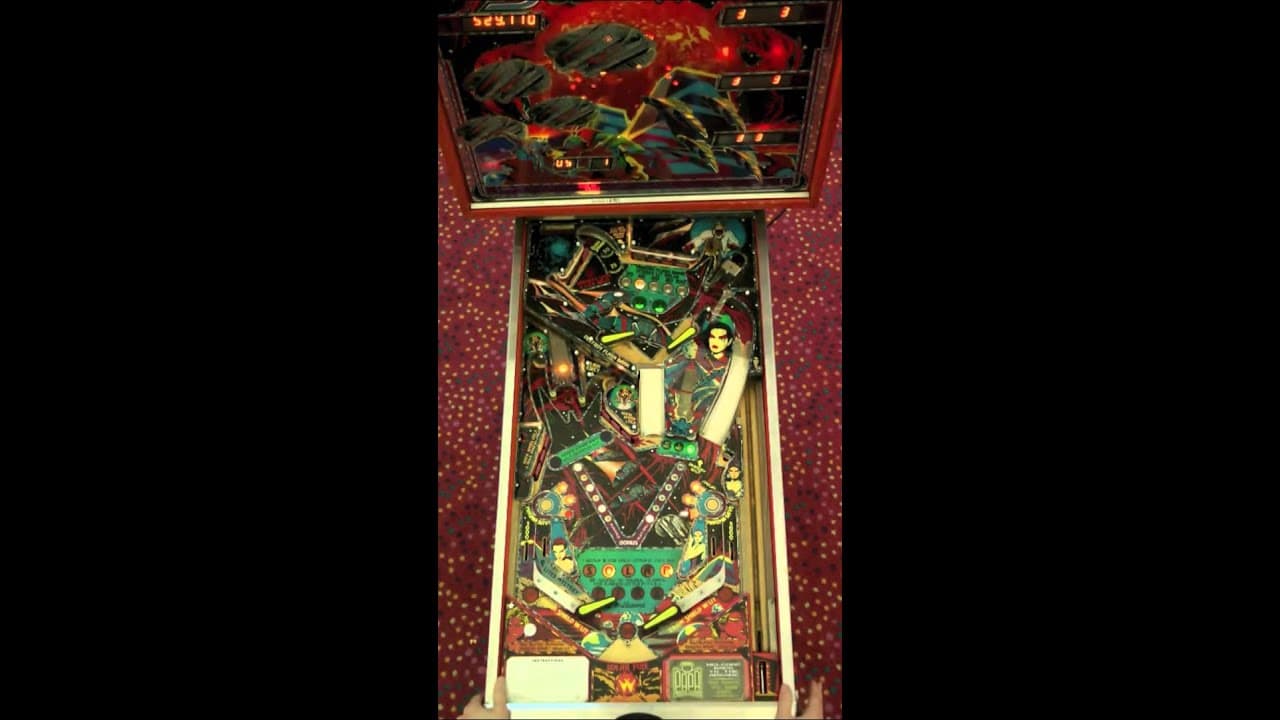 Solar Fire has possibly the most complex rule set of its time; Elektra would be the other contender. The playfield is similar to the more common Grand Lizard, featuring a drop target 5-bank on the upper playfield with 5-level timing-based scoring [value locked in at 20K, 40K, 60K, 80K or 100K with first target dropped]. The targets reset if not completed quickly. Completing the top 3-bank when flashing spots a FIRE letter; getting the flashing FIRE letter gives 20 seconds of double scoring. The upper 3-bank lights the loop behind it for 25K, then 50K, then drain shield. You can sometimes score this loop twice by shooting the ball into the loop on the bottom end, where it can go in and up, trip the switch hidden under the plastic, then fall back down that way to trip the switch again rather than continuing out the top. Multiball here is far riskier than on Grand Lizard. You need to complete the lower left target bank or lower center target bank to light a lock. Which order the locks light in appears random. Two-ball multiball play starts when you lock your second ball in either the lower center or top right saucer. Locking all three balls starts multiball; note this requires locking your second ball in the far left saucer. Subtle! The top 5-bank scoring is 2X during 2-ball multiball and 3X during 3-ball multiball … BUT once you lose a ball in 3-ball multiball, your 3X ends even though you still have 2 balls in play – no 2X then. It’s pretty easy to lose one ball quickly while trying to juggle things on multiple levels, so odds are your 3X won’t last long. After draining one ball during three-ball multiball, you can relight a lock by completing one of the 3-banks. Collecting S-O-L-A-R letters in the chute at the left between the lower saucers each give you 1 additional bonus X up to 6X max. The lit letter in SOLAR changes continuously, so you may need more than 5 shots to get all the letters. Base bonus goes up to 63K on each side for a maximum of 756K at 6X. Left side is bonus earned during single-ball play; right side is bonus earned during multiball play. Unique! The game has both magna saves and drain shield. The magna saves are activated by buttons on either side above the flipper button and trigger the magnet above the return lane on that side of the machine. Finishing a 3-bank awards a magna save activation, up to three times per side. The drain shield is activated by completing the upper left target 3-bank three times and activates one outlane as protected (sides alternate). When active, a ball draining through the lit side is returned to play. Ball control. The top saucer should kick the ball out to the upper left flipper. You’ll find that balls that fall just below the upper right flipper but still manage to hit the metal above the center ramp will bounce just enough to be tipped by the upper left flipper and kept on the upper playfield. Keep your left flipper down and ready when the ball goes there. The center ramp is by far the easier route to the top vs. the right ramp. Check before you play to see if the center post between the flippers has been removed or had the rubber taken off. Ignore the solar gun captive ball shot.