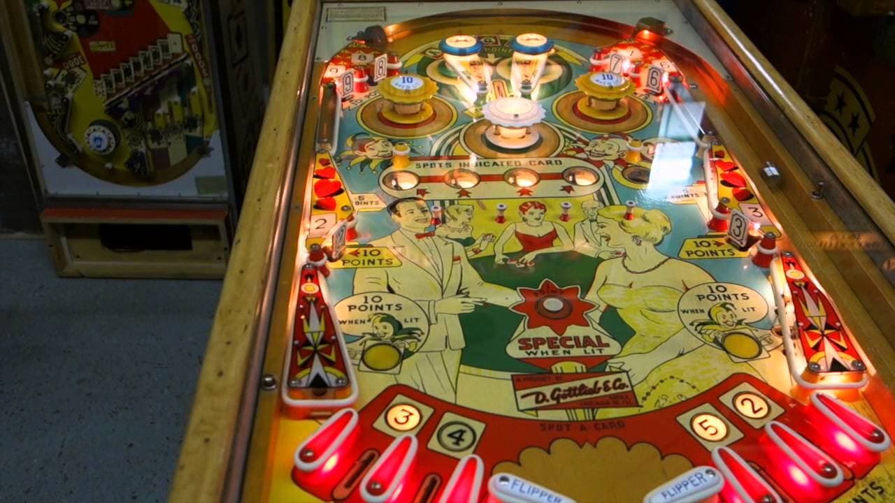 The Spot-A-Card pinball machine, released by D. Gottlieb & Co. in August 1960, is an electro-mechanical game designed by Wayne Neyens, with artwork by Roy Parker. This game features a card and gambling theme, utilizing two flippers, three pop bumpers, four kick-out holes, and a gobble hole.