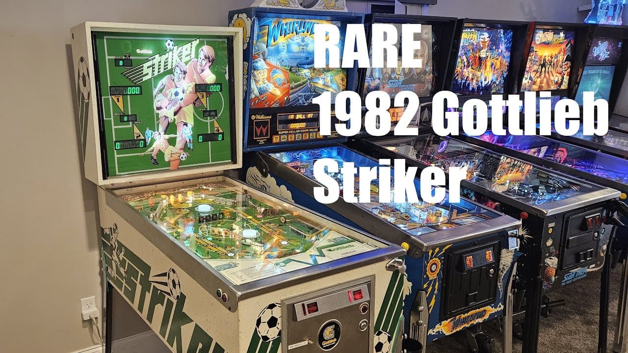 The "Striker" pinball machine by Gottlieb, released in November 1982, features a unique layout with six flippers and a wide-body cabinet design. It includes 14 drop targets, four slingshots, and two spinners, offering a dynamic gameplay experience. Despite being released during a challenging time for pinball manufacturers, 910 units were produced. The game is known for its creative design and distinctive sound effects, including speech and cheering crowds.