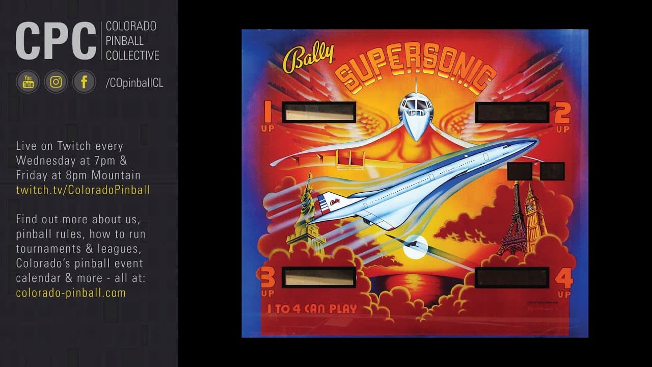 The Supersonic pinball machine, produced by Bally in 1979, celebrates the era of supersonic air travel, prominently featuring the Concorde on its backglass and playfield. Designed by Greg Kmiec with artwork by Kevin O'Connor, this solid-state machine includes two flippers, three pop bumpers, five drop targets, and a spinner, among other elements.