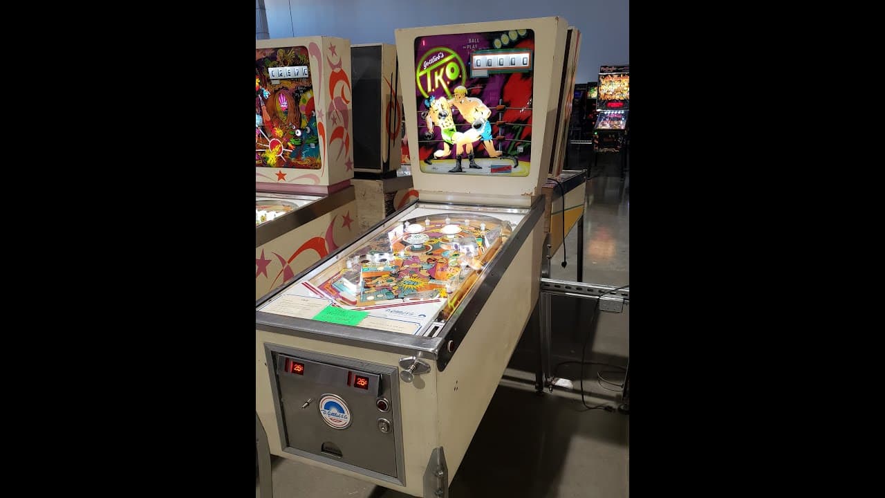 The T.K.O. pinball machine, released by D. Gottlieb & Co. in 1979, was the last single-player electro-mechanical (EM) wedgehead game produced by the company. Designed by Ed Krynski with artwork by Gordon Morison, this boxing-themed game features three pop bumpers, two kick-out holes, and two 3-inch flippers.