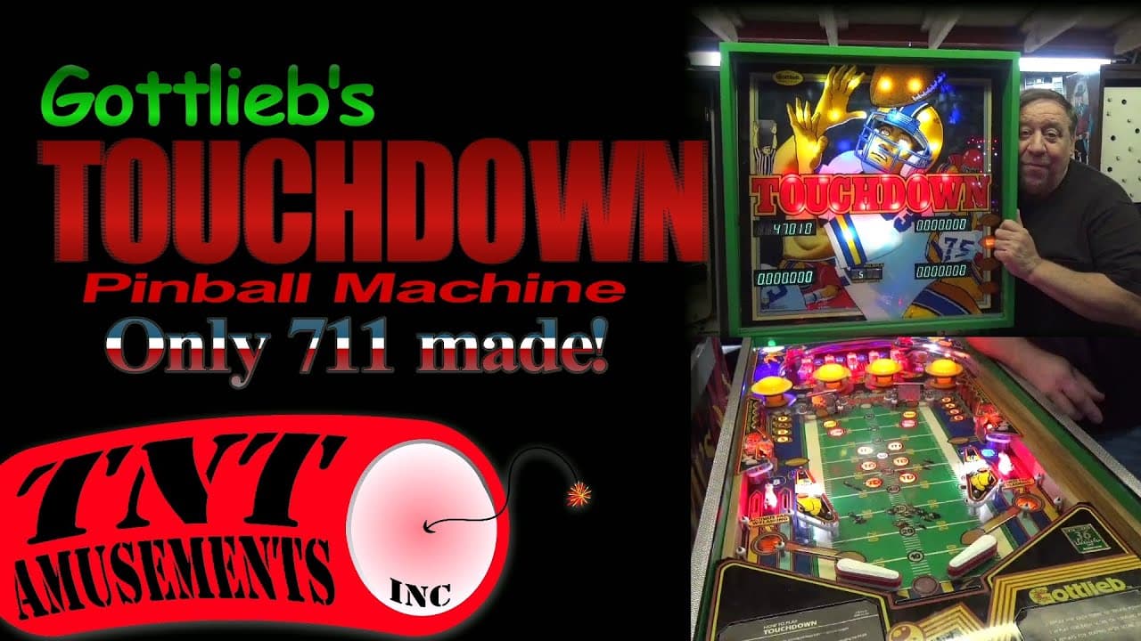 "Touchdown" is a football-themed pinball machine released by D. Gottlieb & Co. in October 1984. Designed by John Trudeau, it features a solid-state setup with two flippers and no ramps or multiball, reflecting its era's straightforward gameplay. With 711 units produced, the game is part of the Gottlieb System 80A series and has a digital display.