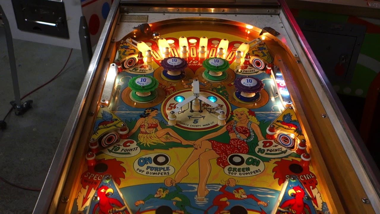 The Tropic Isle pinball machine, released by D. Gottlieb & Co. in April 1962, was designed by Wayne Neyens with artwork by Roy Parker. Featuring a tropical island theme, it includes two flippers, four pop bumpers, and a standout backbox animation where monkeys climb a tree, awarding replays as they reach the top.