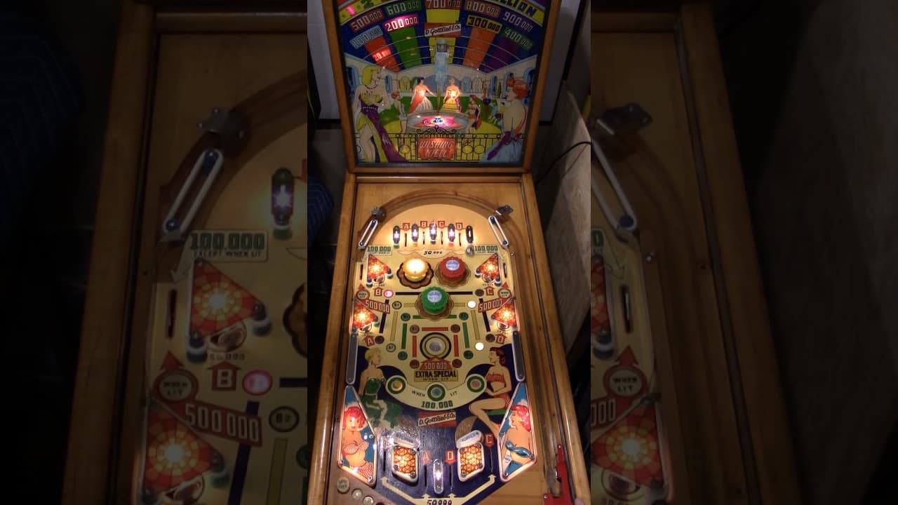 "Wishing Well," released by D. Gottlieb & Co. in September 1955, is a single-player, electro-mechanical pinball machine designed by Wayne Neyens, with artwork by Roy Parker. The game features a whimsical wishing well theme, with the backglass depicting a young girl tossing a coin into a well, surrounded by playful cherubs.