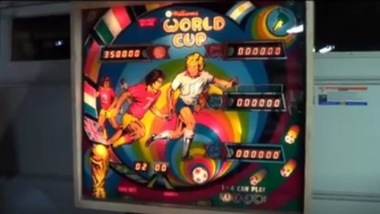 "World Cup" is a solid-state pinball machine released by Williams Electronic Games Inc. in March 1978. Designed by Edward Tomaszewski with artwork by Christian Marche and sound by Randy Pfeiffer, this machine was notable for being the first Williams pinball game to feature electronic sounds instead of traditional chimes, marking a significant technological shift for the company. The game has a soccer theme and includes features like two flippers, pop bumpers, rollover buttons, kick-out holes, standup targets, and a spinning target.