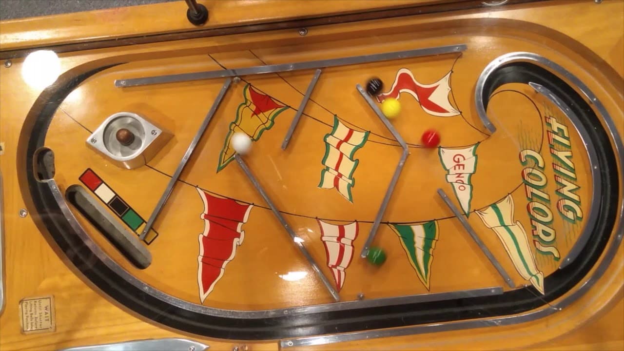 Genco’s Flying Colors is a 1935 pure mechanical game that was primarily intended to be a gambling machine. In the game, you plunge five colored balls down a board of angled railways and cross your fingers that they end up in the right order at the bottom. Doing so awards you replays, which would be paid out by the operator.