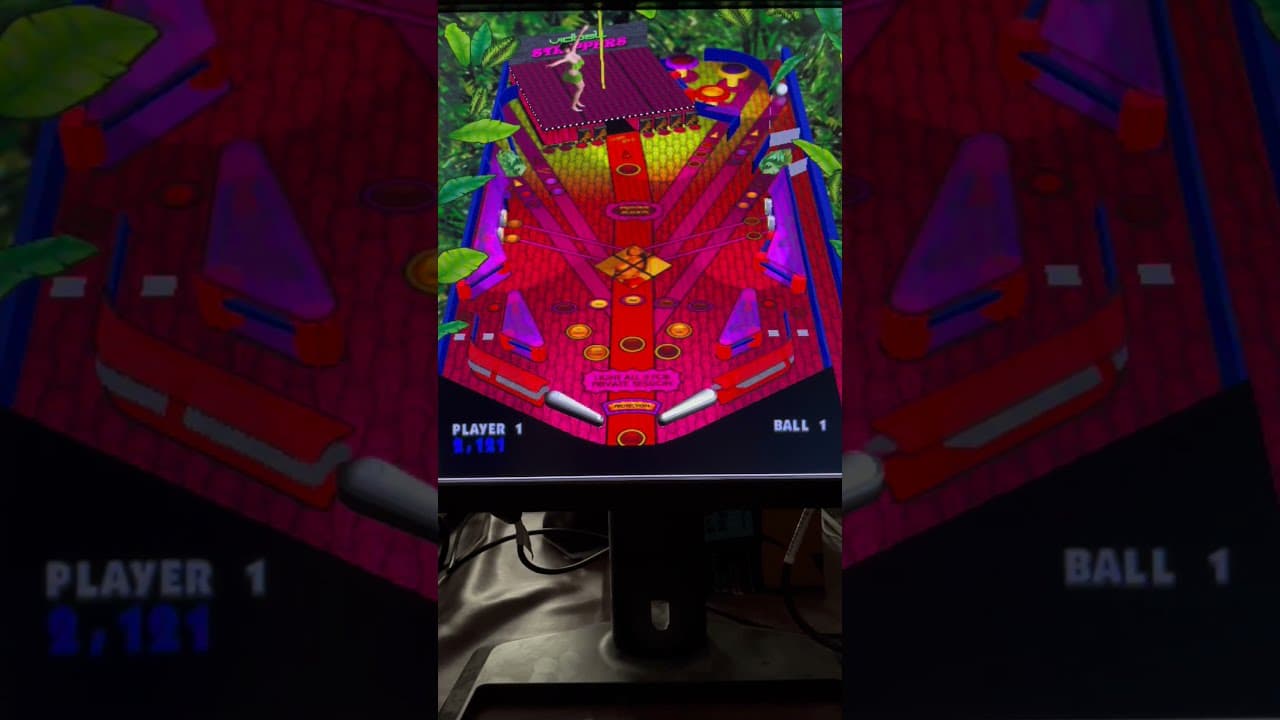 The initial team was made up of three people: Myself as Lead Programmer, Game Designer, and Game Lead; Alesia Howard as Lead Artist; and Donny Hamilton as Modeler/Illustrator. Brian Eddy was also brought on as remote co-designer and consultant. Design docs were drawn up. Cabinet mock-ups were made. And ultimately a prototype was created. In an attempt to pique the interest of the WMS leadership, it was decided to make our first prototype one of the adult-only risque tables. Since this was to be a proof-of-concept, the game rules were kept simple. It consisted of a fairly basic playfield design, with outer loops and drop-targets, but backing the drop-target bank was a stage, and on the stage was a pole-dancer dressed in leaves. As you hit the drop-targets, leaves would fall from her body, until ultimately she would be dancing naked.